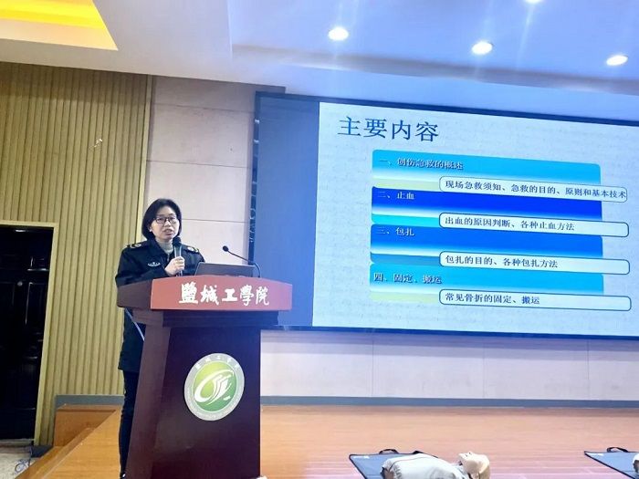 盐城市急救医疗中心培训科窦爱华讲解了创伤救护知识,梳理了创伤现场救护的目的、原则和救护过程,用图示帮助大家掌握创伤止血包扎固定搬运技术。