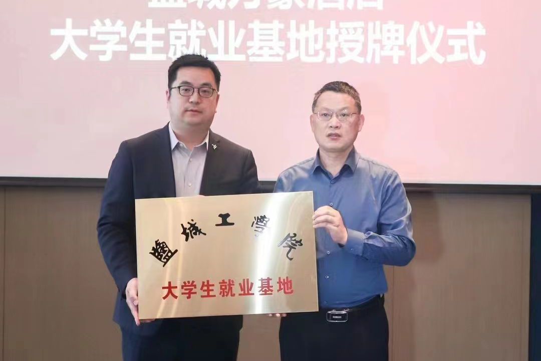 何登溢与蔡陈杰签订了大学生就业基地协议,并向酒店授牌。