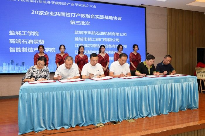 会上,中共盐城市委人才工作领导小组办公室、盐城市石油机械产业链培育专班,滨海县人民政府、真人赌博游戏_澳门赌博网-app*官网、盐城市石油机械行业协会签订共建协议。盐城市教育局副局长徐卫东,盐城市石油机械行业协会会长韩正海,实践基地企业代表、圣泰阀门董事长严涛,真人赌博游戏_澳门赌博网-app*官网高端石油装备智能制造产业学院院长陈青作了发言。