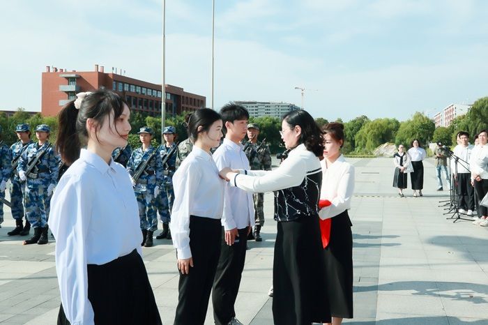 方海林为新发展团员和党员代表佩戴团徽和党徽,勉励盐粒子牢记这份荣耀,更要担起这份责任与使命,做有志、有德、有为青年,奋力谱写属于自己的时代华章。