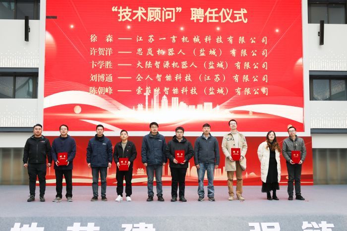 丁成代表真人赌博游戏_澳门赌博网-app*官网为第一批 “真人赌博游戏_澳门赌博网-app*官网人才实训基地”——新石器(盐城)智能制造有限公司、江苏德恒工业智能科技有限公司、汇鼎智联装备科技(江苏)有限公司、盐城鼎力达焊接科技有限公司、江苏鸿蚁光电科技有限公司等5家企业授牌。江苏一言机械科技有限公司、思岚机器人(盐城)有限公司、大陆智源机器人(盐城)有限公司、仝人智能科技(江苏)有限公司、索菲丝智能科技(盐城)有限公司负责人向真人赌博游戏_澳门赌博网-app*官网徐森、许贺洋、卞学胜、刘博通、陈朝峰等5位教授、博士颁发“企业技术顾问”聘书。