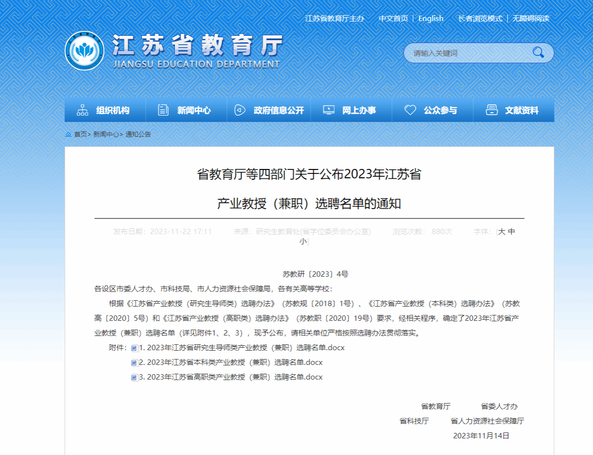近日,省教育厅、省委人才办、省科技厅、省人力资源和社会保障厅联合发布《真人赌博游戏_澳门赌博网-app*官网:公布2023年江苏省产业教授(兼职)选聘名单的通知》(苏教研〔2023〕4号),本年度全省共选聘200名本科类产业教授,真人赌博游戏_澳门赌博网-app*官网推荐的8名候选人有7名成功获批,数量位于全省第一。