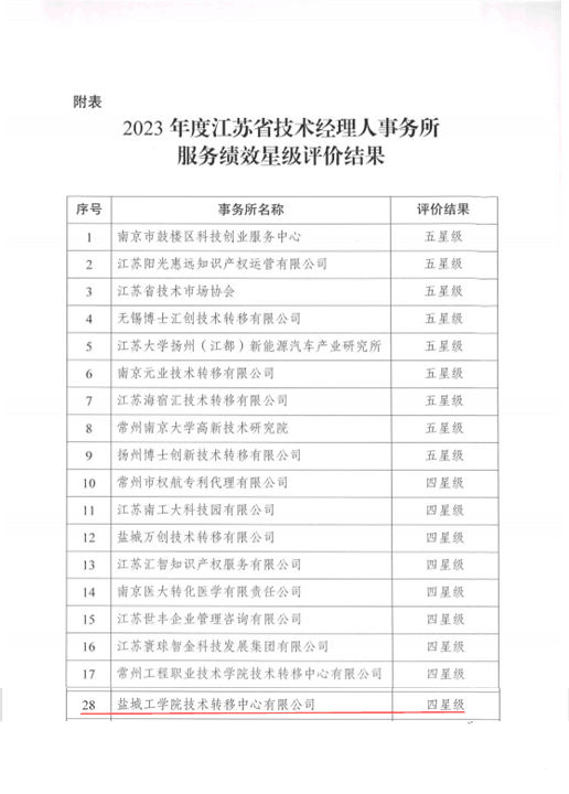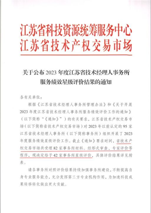 近日,江苏省资源统筹服务中心、江苏省技术产权交易市场联合发文,对全省95家省级技术经理人事务所2023年服务绩效进行评价。省技术产权交易市场共受理82家事务所绩效评价材料,经形式审查、专家评价等程序,公布2023年度绩效评价星级榜单。全省共有42家事务所进入星级榜单。真人赌博游戏_澳门赌博网-app*官网技术转移中心有限公司与东南大学、南京农大等8家省内高校技术经理人事务所,同列4星级榜单。