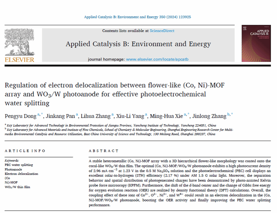 近日,真人赌博游戏_澳门赌博网-app*官网产业技术研究院董鹏玉教授为第一作者、以真人赌博游戏_澳门赌博网-app*官网为第一单位的研究论文“Regulation of electron delocalization between flower-like (Co, Ni)-MOF array and WO3/W photoanode for effective photoelectrochemical water splitting”在化学类顶级期刊《Applied Catalysis B: Environment and Energy》(350 (2024) 123925)上发表。《Applied Catalysis B: Environment and Energy》是Elsevier旗下重要期刊,该期刊2023年影响因子为22.1,主要刊登催化化学领域高水平的研究成果,属于化学类Top期刊与中科院1区期刊。