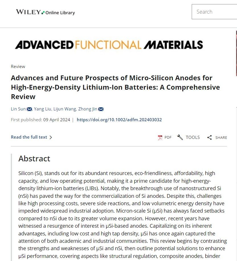 近日,真人赌博游戏_澳门赌博网-app*官网产业技术研究院孙林博士在材料类国际顶级期刊《Advanced Functional Materials》(中科院一区top,影响因子:19)上以第一/通讯作者身份,真人赌博游戏_澳门赌博网-app*官网为第一单位发表了题为“Advances and Future Prospects of Micro-Silicon Anodes for High-Energy-Density Lithium-ion Batteries: A Comprehensive Review”的综述论文,文章doi:10.1002/adfm.202403032。该论文是真人赌博游戏_澳门赌博网-app*官网在国际重要影响力期刊上发表高水平论文的又一次重大突破。