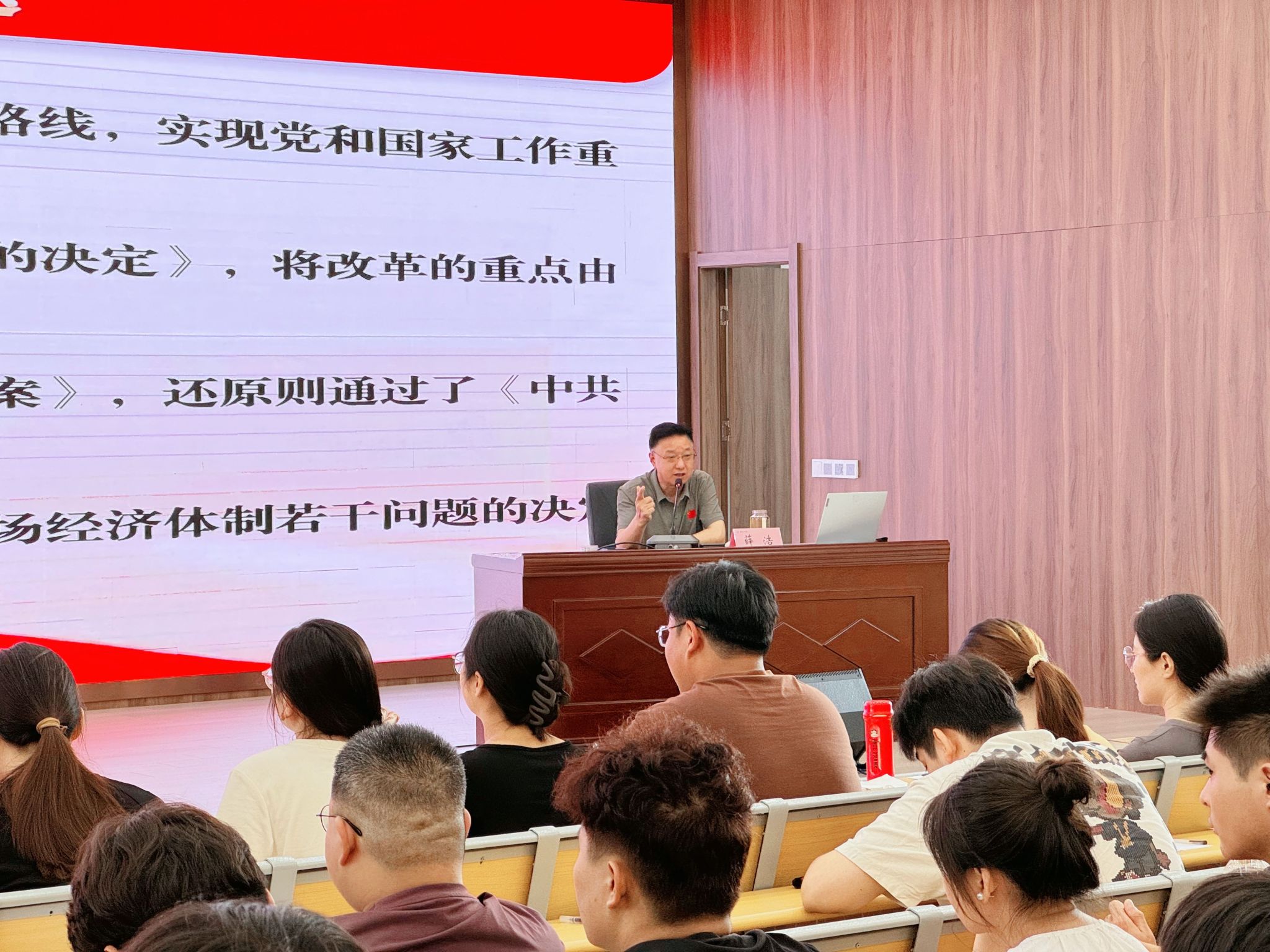薛浩着重围绕“以进一步全面深化改革为动力推进中国式现代化建设”,从六个方面对党的二十届三中全会精神进行了全面深入的讲解。他首先回顾了全会召开的重大意义和主题,梳理了全会报告《中共中央真人赌博游戏_澳门赌博网-app*官网:进一步全面深化改革、推进中国式现代化的决定》的起草过程,结合具体而生动的案例,重点解读了《决定》中所聚焦的主要问题及重要举措,深入剖析了抓好改革落实的相关要求,使全体师生对党的二十届三中全会的思想精髓和核心要义有了更为准确的理解和把握。课上,他还就如何在实际学习、工作和生活中贯彻落实党的二十届三中全会精神提出了具体建议,同时勉励研究生们要挺膺担当,胸怀“国之大者”,以实际行动践行初心使命,为推进中国式现代化贡献青春力量。