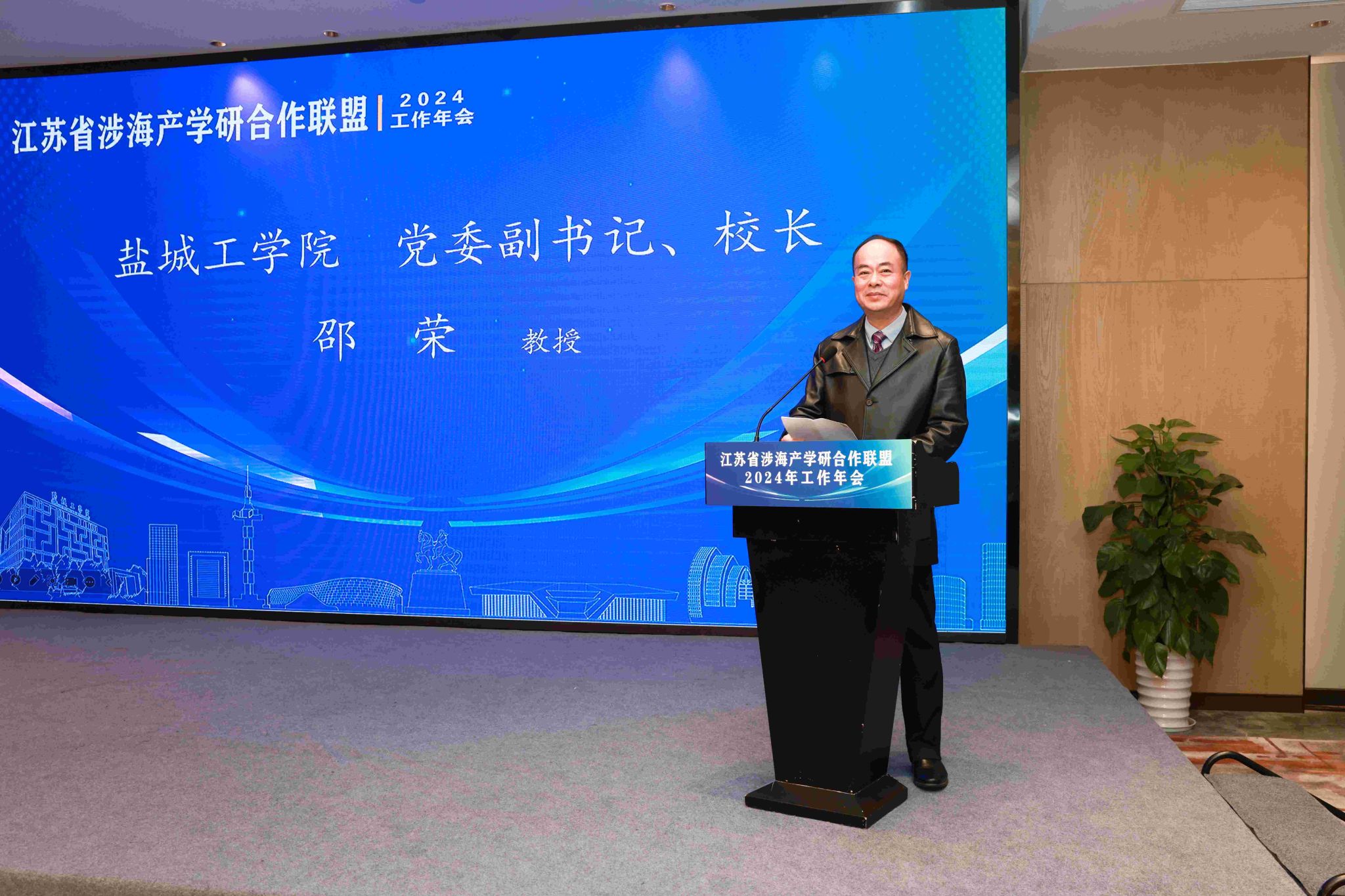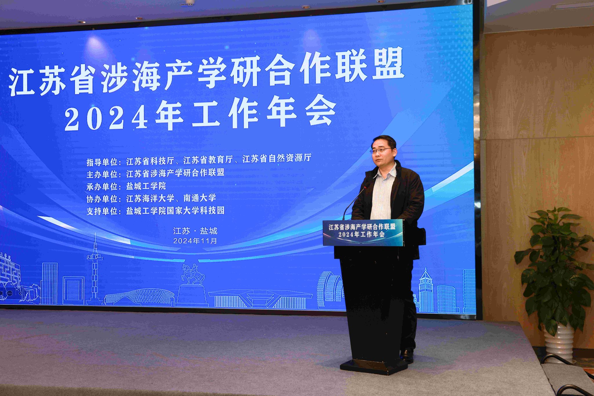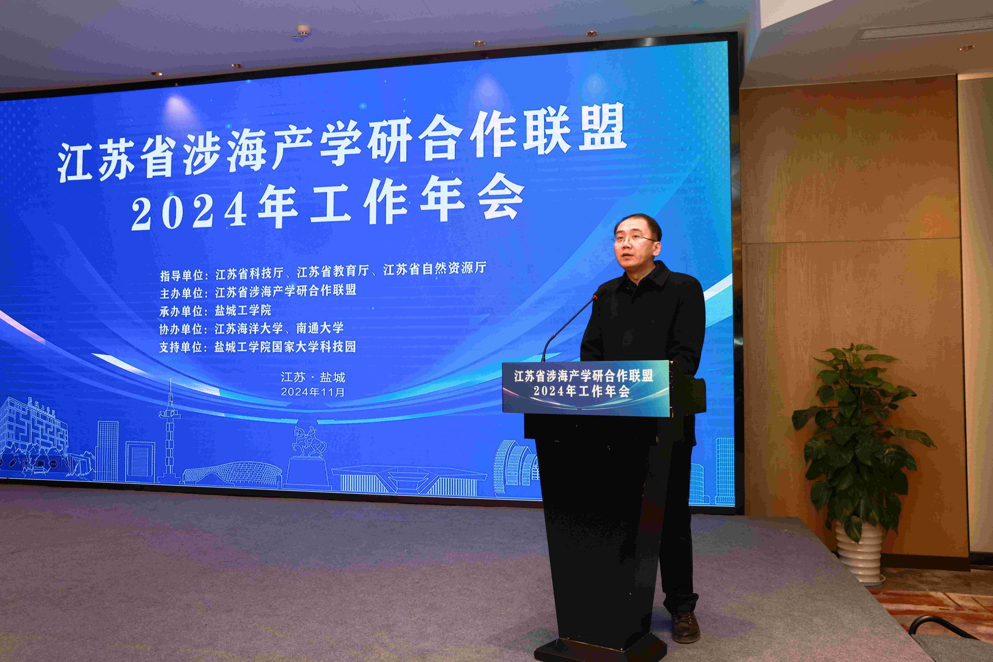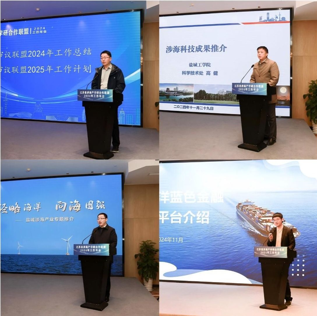 11月29日下午,江苏省涉海产学研合作联盟2024年工作年会在盐城召开。本次年会由真人赌博游戏_澳门赌博网-app*官网承办,党委副书记、校长邵荣致辞。江苏海洋大学党委副书记、校长汤建,江苏海洋大学原党委副书记、校长宁晓明,江苏省科技厅区域创新与成果转化处副处长祝永坚,江苏省自然资源厅海洋规划与经济处三级调研员刘军强,南通大学党委常委、副校长华亮,江苏科技大学党委常委、副校长周宏根,江苏海洋大学党委常委、副校长申欣,江苏省生产力促进中心科技资源开发与技术转移处副处长(主持工作)巢俊,连云港市科技局副局长李传志,盐城科技局副局长王兆军,南通市科技局党组成员、局长助理孙青山,以及真人赌博游戏_澳门赌博网-app*官网海洋与生物工程学院、大学科技园相关负责人,科学技术处的全体人员参加本次会议。