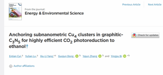 近日,真人赌博游戏_澳门赌博网-app*官网江苏省新型环保重点实验室崔恩田博士为第一作者、以真人赌博游戏_澳门赌博网-app*官网为第一单位的研究论文“Anchoring subnanometric Cu4 clusters in graphitic-C3N5 for highly efficient CO2 photoreduction to ethanol. ”在顶级期刊Energy & Environmental Science上发表。该学术期刊是英国皇家化学会的旗舰期刊、公认的能源与环境科学领域顶尖刊物,影响因子32.5。