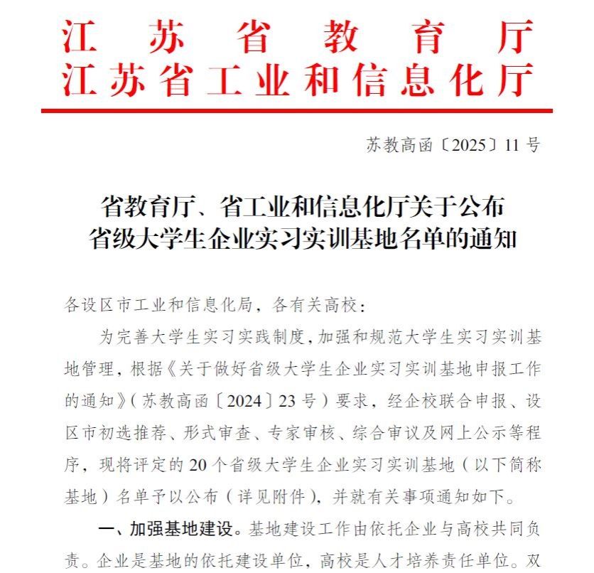 江苏省大学生企业实习实训基地是由省教育厅、省工业和信息化厅联合评定,旨在聚焦推进新型工业化、加快建设制造强省目标任务,依托省内优质企业资源,面向全省高校开展学生实习实训等教学活动,搭建产教协同育人平台,培养服务支撑产业发展的急需人才。省教育厅将优先支持省级基地在产学协同育人项目、现代产业学院、专业特色学院等平台项目申报,省工信厅将择优给予依托企业相关专项资金、制造业人才计划与创新人才资源等方面支持。