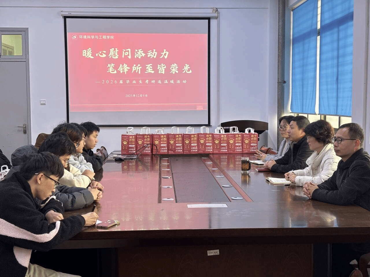 为帮助考研学子缓解备考压力,鼓舞备考士气,12月9日,环境学院组织开展考研慰问活动。党总支书记孟鑫、党总支副书记王丽坤、团委书记陈超然、兼职辅导员翟平深入考研自习室,为学子们送上暖心关怀与真挚祝福。