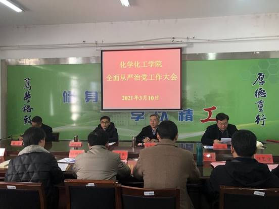 为深入学习贯彻十九届中央纪委五次全会、十三届省纪委六次全会和真人赌博游戏_澳门赌博网-app*官网全面从严治党工作大会精神,3月10日下午,化学化工学院在北校区学院会议室召开全面从严治党工作大会。学院党委书记谢毅敏主持,院长奚新国,副院长戴勇,党委副书记兼纪检委员江滔,学院各党支部、各部门负责人,全体教职工参加大会。