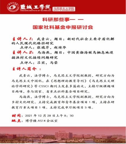12月28日上午,马克思主义学院在南校区博学楼514会议室召开国家社科基金申报研讨会。院党总支书记、常务副院长钱长锋,副院长赵迎华出席,2022年国家社科基金申报人员、学院青年博士、新进青年教师等20余人参加,会议由马克思主义学院院长助理马荣主持。