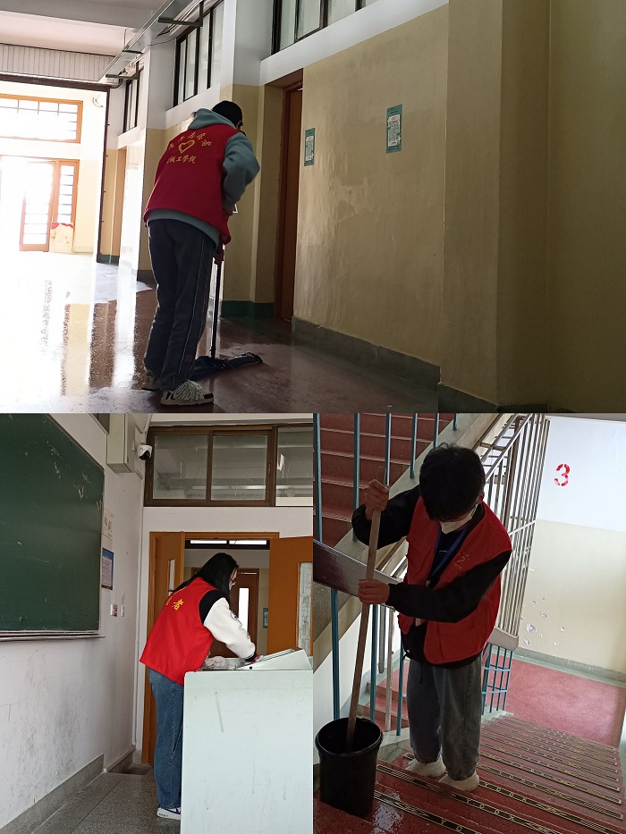 下午2点,志愿者们身穿红色志愿者马甲,佩戴好口罩,在相应教学楼区域集合。在保洁阿姨的指导,志愿者们对教学楼进行分层、分步骤打扫和消毒。擦拭教室桌子和门窗、清扫教室和楼层的垃圾、手持喷壶对每个角落进行消毒,志愿者们做得一丝不苟、细致入微。经过两个多小时的努力,楼层教室变得整洁有序,井井有条。