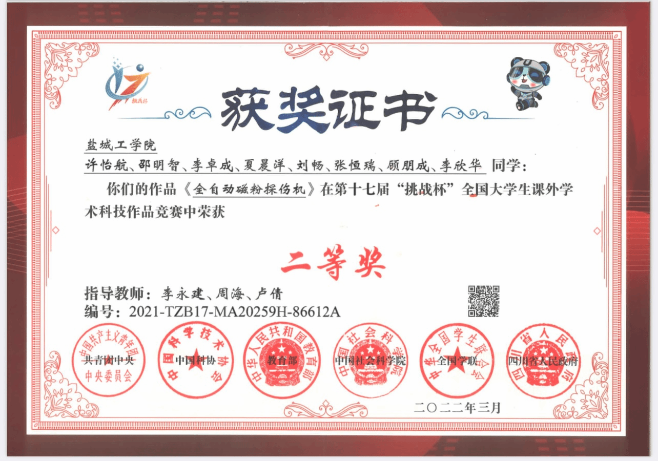 近日,第十七届“挑战杯”全国大学生课外学术科技作品竞赛终审决赛落下帷幕,真人赌博游戏_澳门赌博网-app*官网机械优集学院李永建、周海、卢倩老师指导的作品《全自动磁粉探伤机》荣获第十七届“挑战杯”全国大学生课外学术科技作品竞赛终审决赛二等奖。