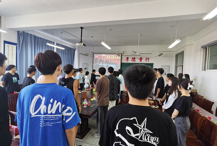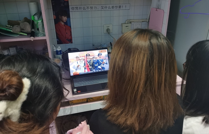 活动中,与会师生一起观看天安门广场国庆升国旗仪式,学院其他同学在宿舍同步观看。