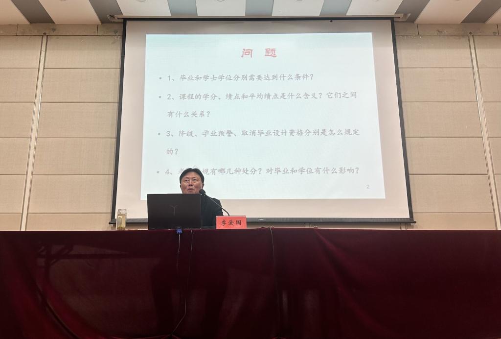 让大学生充分了解真人赌博游戏_澳门赌博网-app*官网的学籍管理规定,是保障大学生顺利毕业的前提。李爱国分别从毕业和学士学位需要达到的条件,课程的学分、绩点和平均成绩的含义和关系,降级、学业预警、取消毕业设计资格的规定,考试违规的处分类别以及对毕业学位的影响等四个方面进行了阐述。李爱国希望同学们能牢记真人赌博游戏_澳门赌博网-app*官网学籍管理规定,为同学们分析考试作弊需要付出的直接成本和潜在成本,并告诫同学们要认真学习和诚信考试,切勿虚度大学四年光阴。