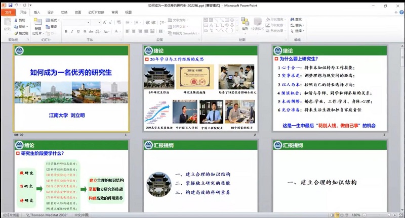 刘立明教授结合自己二十年学习和工作的经历,围绕“为什么要上研究生”进行讲解,从心手合一、实事求是、以人为本、预演机会、未雨绸缪、充分准备等方面进行细致解读。他认为,成为一名优秀的研究生,需要建立合理的知识结构、掌握独立研究的技能、构建高效的科研素养去做研究、写研究、讲研究。他鼓励研究生要及时完成角色上的转变、及时调整自己的心态、管理好自己的精力、保持长期的艰苦奋斗、具备积极主动的工作态度和坚忍不拔的科研精神,要有一流的眼界、一流的思维、一流的心态,主动向经典书籍、权威期刊、专业文献、特定高手等学习。整个课程内容丰富、深入浅出、逻辑严密、案例翔实、引人深思。