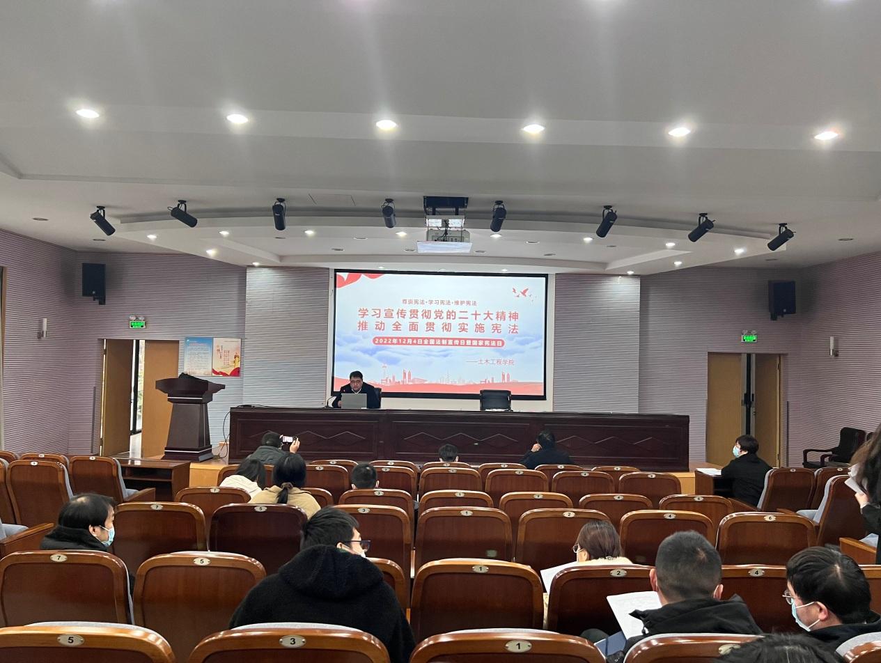 11月30日下午,土木工程学院在土木馆报告厅开展以“学习宣传贯彻党的二十大精神,推动全面贯彻实施宪法”为主题的专题宣讲活动。会议由学院党委书记谷伟主持并宣讲,土木学院全体教职工及部分学生代表参加。