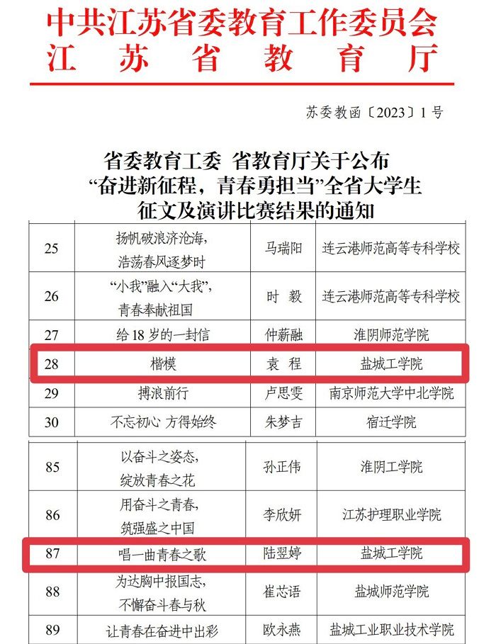 近日,省委教育工委、省教育厅发布《真人赌博游戏_澳门赌博网-app*官网:公布“奋进新征程,青春勇担当”全省大学生征文及演讲比赛结果的通知》,真人赌博游戏_澳门赌博网-app*官网人文社会科学学院汉语言文学专业B中文211班袁程同学和环境科学与工程学院B环工201班陆翌婷同学分别获得一等奖、三等奖。