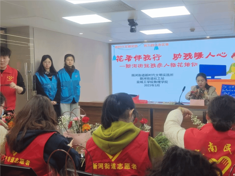 在第60个学雷锋纪念日来临之际,为大力发扬“奉献、友爱、互助、进步”的志愿精神,3月4日上午,数理学院志愿者服务团成员到盐城市新河街道办事处协助开展“实事助残展新篇”残疾人插花培训活动,引领青年学子做一枚闪亮的螺丝钉。