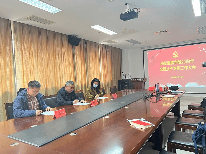 3月20日上午,纺织服装学院召开2023年全面从严治党工作专题会议,党总支书记宋孝浜主持会议,学院全体科级以上干部、专业系(实验中心)主任、党支部书记参加。