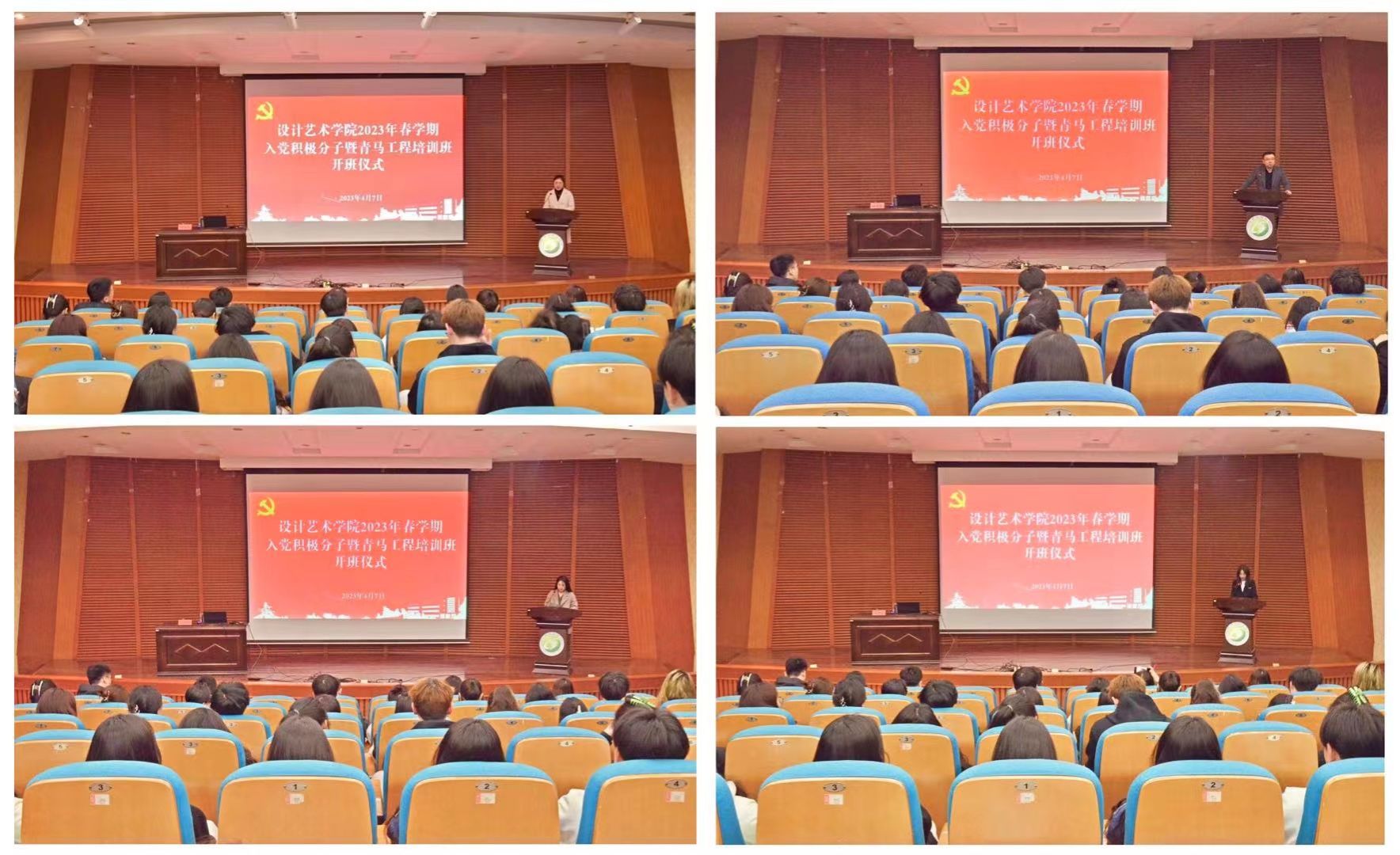 4月7日晚7点,设计艺术学院在南校区润美楼报告厅举行2023年春学期入党积极分子暨青马工程培训班开班仪式。学院党总支书记胡凌霞、学生党支部全体委员、2023年春学期入党积极分子、青马工程培训班学员等120余人参加。活动由学生党支部书记顾清主持。