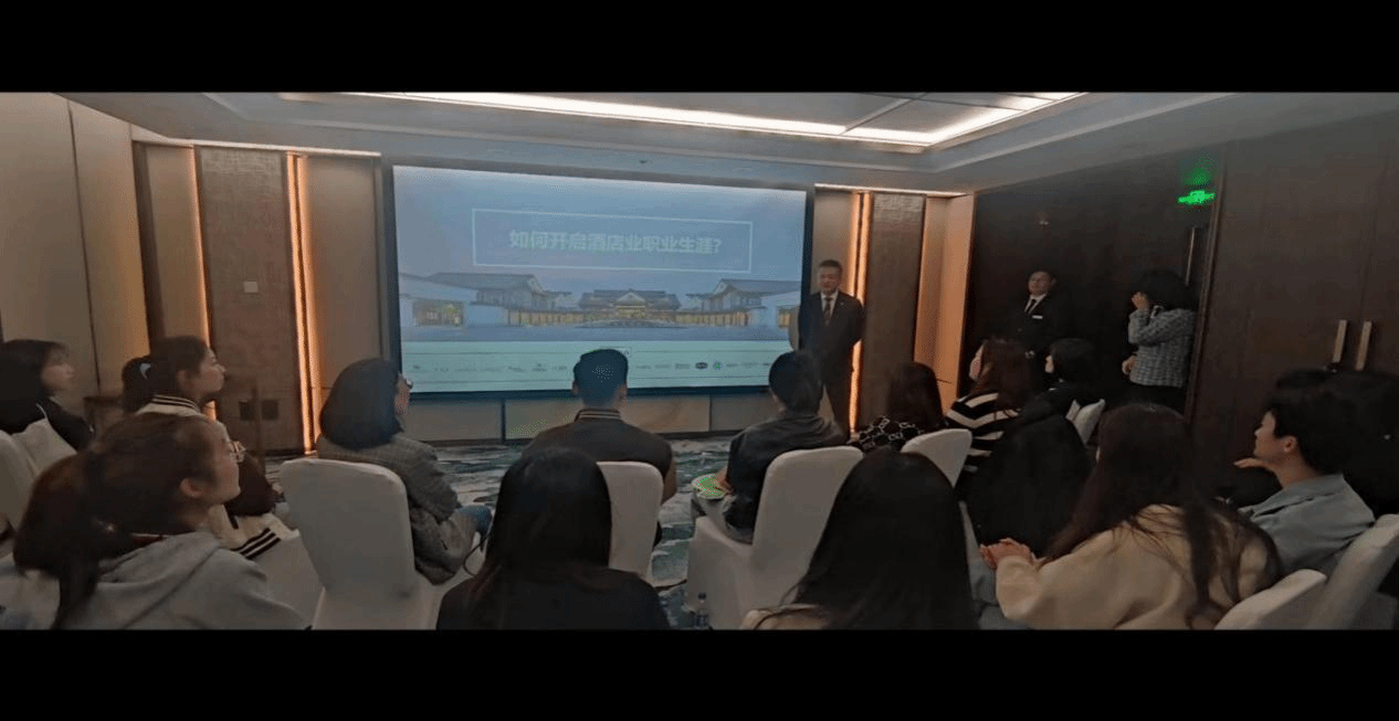 酒店工作人员首先带领老师与同学们参观了酒店客房、餐厅、宴会区域、健身中心以及康体中心,酒店总经理陈俊为大家分享了目前酒店业的发展前景以及希尔顿集团对人才培养的重视,同时结合自身的职业发展历程,为同学们在酒店行业的职业发展给出了建议与指导,激励同学们要选择合适自己的岗位,坚持自己的初心,实现自己的梦想。最后,师生们探望了在酒店实习的大四学生,与实习的同学们展开交流沟通。