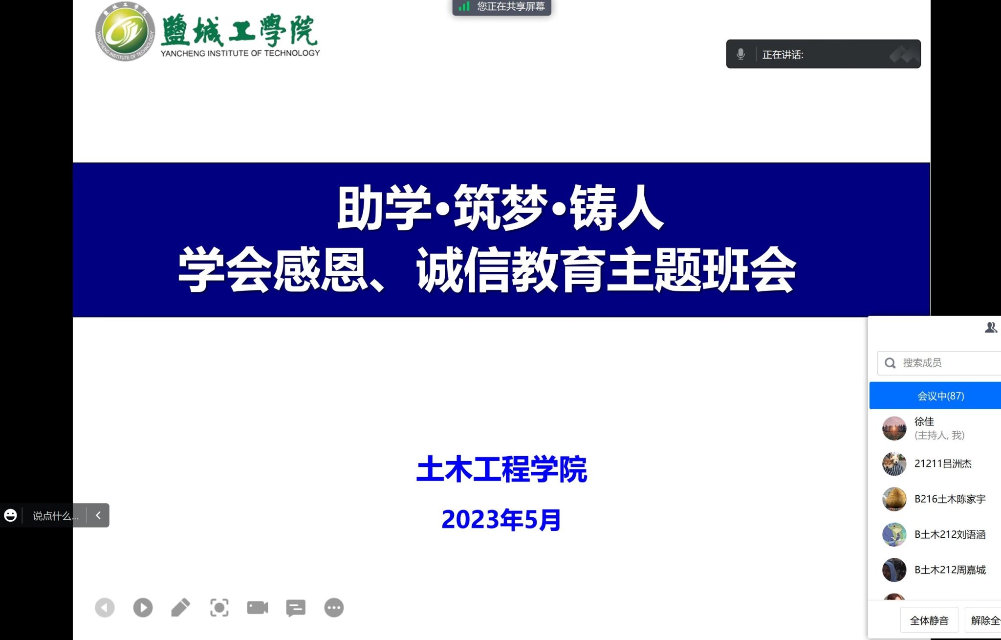 为不断塑造大学生的诚信与感恩品质,进一步推进大学生思想政治教育工作,5月23-25日,土木工程学院全体专兼职辅导员以责任班级为单位,分别在希望大道校区和建军东路校区召开学会感恩、诚信教育主题班会。