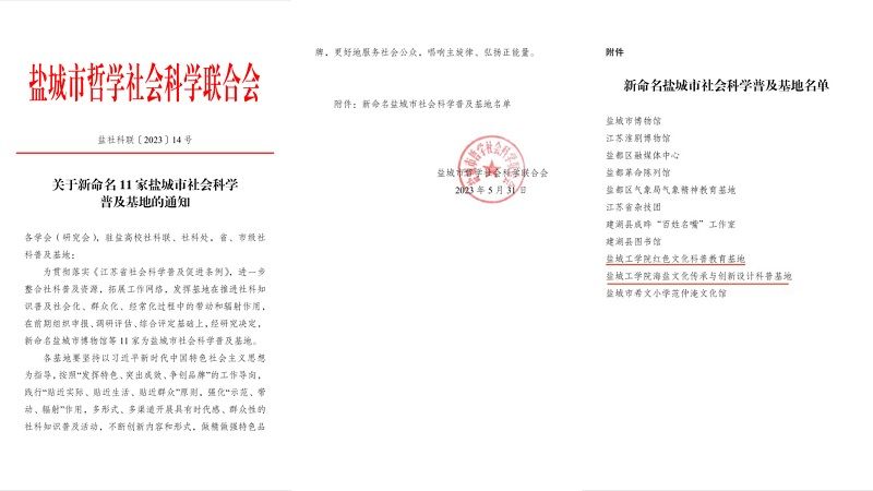 近日,盐城市社科联印发了《真人赌博游戏_澳门赌博网-app*官网:新命名11家盐城市社会科学普及基地的通知》(盐社科联〔2023〕14 号)。真人赌博游戏_澳门赌博网-app*官网马克思主义学院申报的“真人赌博游戏_澳门赌博网-app*官网红色文化科普教育基地”、设计艺术学院申报的“真人赌博游戏_澳门赌博网-app*官网海盐文化传承与创新设计科普基地”获批盐城市社会科学普及基地,是真人赌博游戏_澳门赌博网-app*官网首次获批盐城市社会科学普及基地。