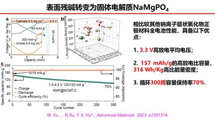 新能源是当前社会发展的热点,钠离子电池因其储量丰富可以与锂离子电池形成互补而备受关注。正极材料决定一个电池的上限,因此需要寻求一款高容量,循环稳定的钠离子电池正极材料。本文首次提出将正极材料的表面残碱转变为磷酸钠镁固态电解质,在正极材料表面形成坚固的界面膜,减少材料与电解液之间的反应,稳定结构。并首次在钠离子电池中发现4.25 V高电压阶段存在高度可逆的OP2相转变,有利于结构的稳定,提升循环性能。