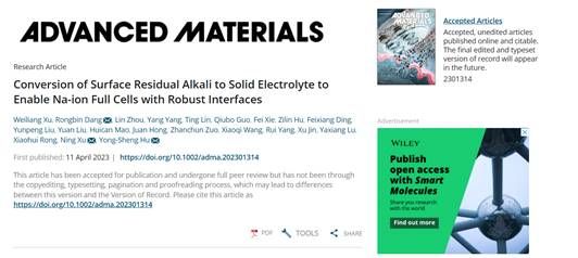 近日,真人赌博游戏_澳门赌博网-app*官网机械学位点硕士研究生许伟良在校内导师许宁教授、洪捐副教授以及校外导师中国科学院物理研究所胡勇胜研究员、容晓晖特聘研究员的共同指导下在国际材料学科顶尖期刊《Advanced Materials》上发表题为“Conversion of Surface Residual Alkali to Solid Electrolyte to Enable Na-ion Full Cells with Robust Interfaces”的研究成果(https://doi.org/10.1002/adma.202301314)。这是真人赌博游戏_澳门赌博网-app*官网研究生首次以第一作者身份在该期刊发表研究论文。《Advanced Materials》是德国Wiley出版集团旗下在工程材料与化学大领域的顶级期刊,在国际材料领域科研界上享誉盛名。该期刊收录材料研究领域最前沿的高端论文,是材料科学领域最具影响力的期刊,目前最新影响因子为32.086。