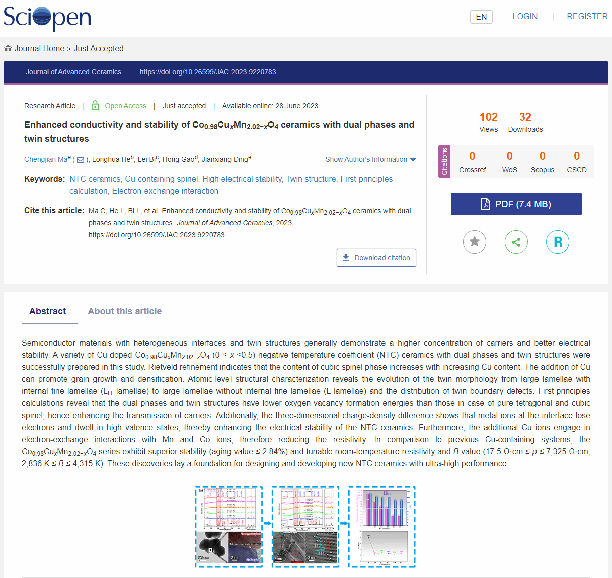 近日,真人赌博游戏_澳门赌博网-app*官网分析测试中心马成建博士(第一作者及通讯作者)与南华大学毕磊教授合作,在陶瓷领域顶级学术期刊《Journal of Advanced Ceramics》发表题为《Enhanced conductivity and stability of Co0.98CuxMn2.02?xO4 ceramics with dual phases and twin structures》的研究论文(https://doi.org/10.26599/JAC.2023.9220783)。《Journal of Advanced Ceramics》是清华大学出版社出版的国际学术期刊,入选“中国科技期刊卓越行动计划”梯队期刊类项目。该期刊主要收录功能陶瓷研究领域最前沿的高端论文,是SCI “材料科学:陶瓷”分类中首个影响因子相继突破6.0、10.0及15.0的期刊,目前最新影响因子为16.9。