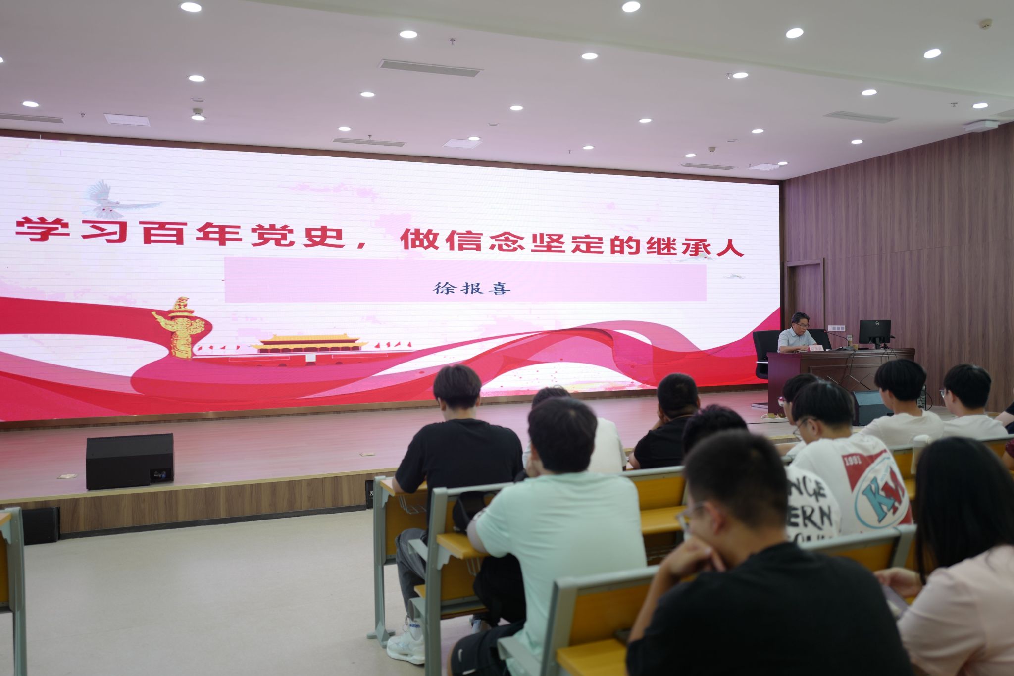徐报喜以“学习百年党史,做信念坚定的继承人”为主题,从“百年党史的艰辛与辉煌”“新时代中国再出发”“赓续共产党人精神血脉,做信念坚定的继承人”三个部分为研究生新生做理想信念教育讲座。他强调,我们要学深悟透习近平总书记“心有所信,方能行远,走好新时代的长征路,我们更需要坚定理想信念,矢志拼搏奋斗。”重要讲话精神,将理想信念教育做为研究生入学教育的第一讲,更好地铸牢学生信仰之基,补足精神之钙。