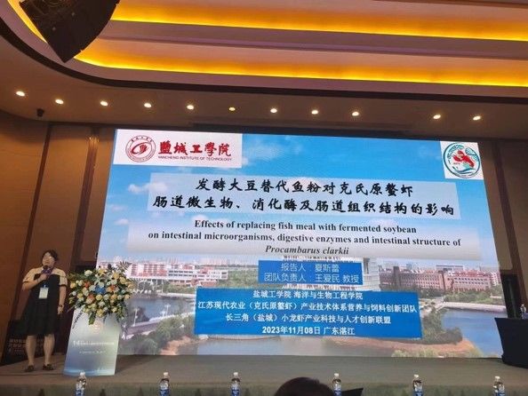 会上,夏斯蕾博士作题为《发酵大豆替代鱼粉对克氏原螯虾肠道微生物、消化酶及肠道组织结构的影响》的学术报告,介绍了在当今配合饲料需求增大,鱼粉短缺背景下,团队通过前期在发酵大豆菌种选择、工艺优化、发酵前后营养组成对比及微生物分布变化的研究基础上,综合分析发现在克氏原螯虾饲料中使用25%发酵大豆替代鱼粉具有显著改善克氏原螯虾肠道健康的效果,这为生产上节约鱼粉等原料提供很好的思路。江青青同学在研究生论坛以《饲料中添加苏氨酸对克氏原螯虾生长性能和肌肉品质的影响》为题,分享了通过评价克氏原螯虾生长和肌肉品质得出克氏原螯虾饲料中最适的苏氨酸添加水平。