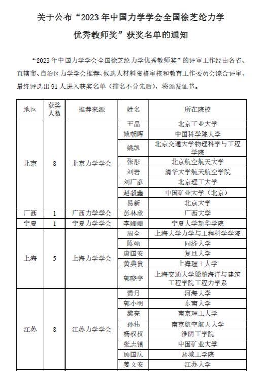 “全国徐芝纶力学优秀教师奖”由中国力学学会设立并颁发,是全国力学教师最高的荣誉之一,旨在表彰在力学教学改革、教书育人和科学研究方面取得突出成绩的教师。该奖项每两年评选一次。此次全国共评选出91名获奖者,江苏省共8人入选。