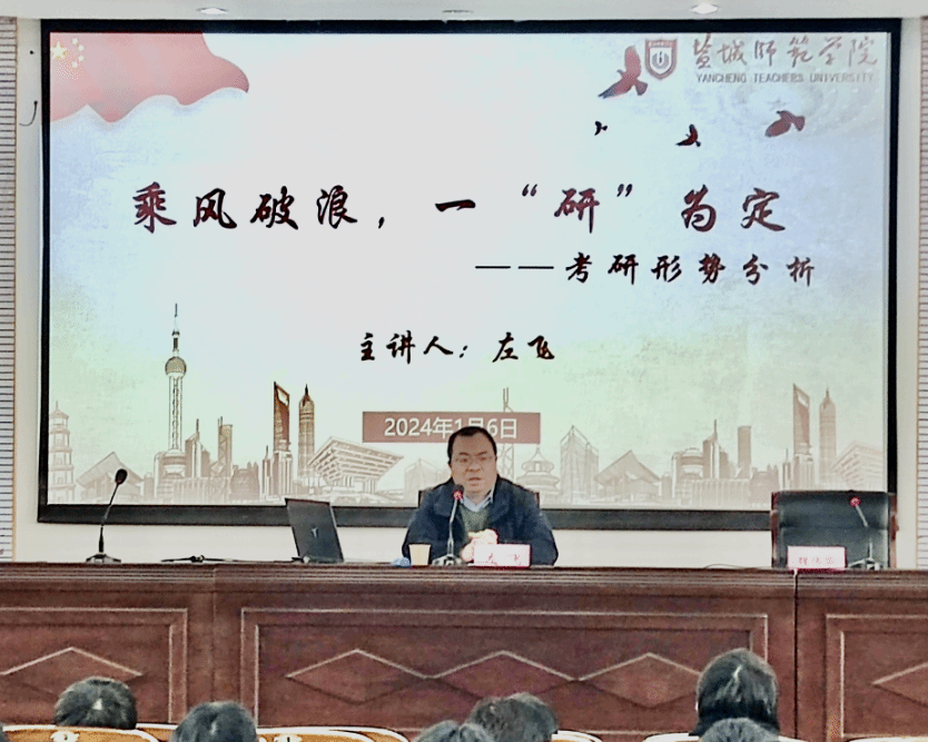 会议还邀请了盐城师范学院数统学院党总支副书记左飞作考研备考专题讲座。他从“为什么要考研”“如何择校”以及“考研该做哪些准备”三个方面为备考学生提供了具体的指导。他指出,考研学生要结合自身实际情况,科学选择合适的真人赌博游戏_澳门赌博网-app*官网与专业;要善于借助专业资源,促进学科精练精通;要科学规划时间,以扎实有效的学习效果打好考研这场耐力战与持久战。最后,他以“路虽远,行则将至;事虽难,做则必成。”激励同学们树立考研目标,坚定必胜信念。