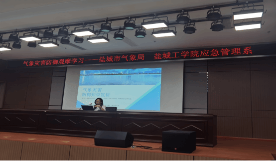 观摩结束后,市气象台台长、市气象学会秘书长周宏伟作题为《气象灾害防御知识宣讲》的报告,报告分为四个部分:盐城气候特征、灾害性天气简述、气象灾害防御、应对气候变化等。周台长通过图文并茂的方式详细讲解了我市常见气象灾害类型及防御应对措施、我市气象灾害应急预案体系及其地位、气象灾害监测和预警技术等。