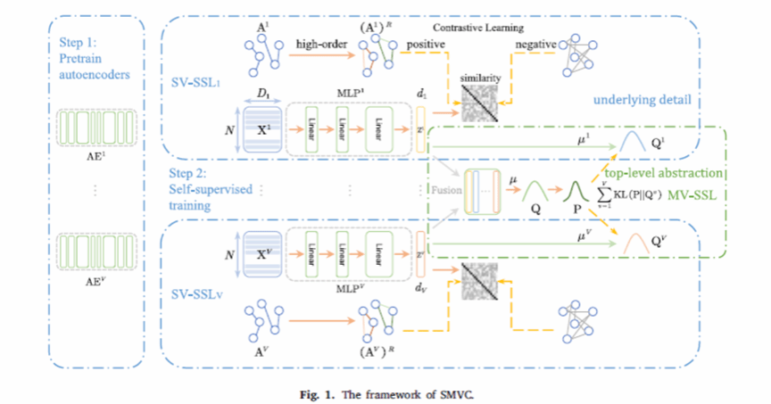 论文针对多视图聚类问题,提出了顶层抽象与底层细节结合的结构化深度多视图聚类算法(Structural deep Multi-View Clustering with integrated abstraction and detail, SMVC)。深度多视图聚类可以从不同的视图中获得互补的信息,因此吸引了越来越多的关注。然而,现有的深度多视图聚类算法缺乏对结构信息的挖掘,并且容易被质量差的视图影响。论文所提出的SMVC算法,用多层感知器提取单个视图的特征,然后通过级联形成全局嵌入空间。构建全局的聚类软分配目标分布,并用其指导单个视图的聚类软分配。SMVC算法不仅设计了对顶层抽象的利用,而且还设计了对底层细节的挖掘。SMVC算法利用高阶邻接矩阵构建了实例级别的对比学习,获得了与图注意力网络等价的效果,并且减少了特征的冗余性。在四个基准数据集上的实验验证了所提方法的优势。