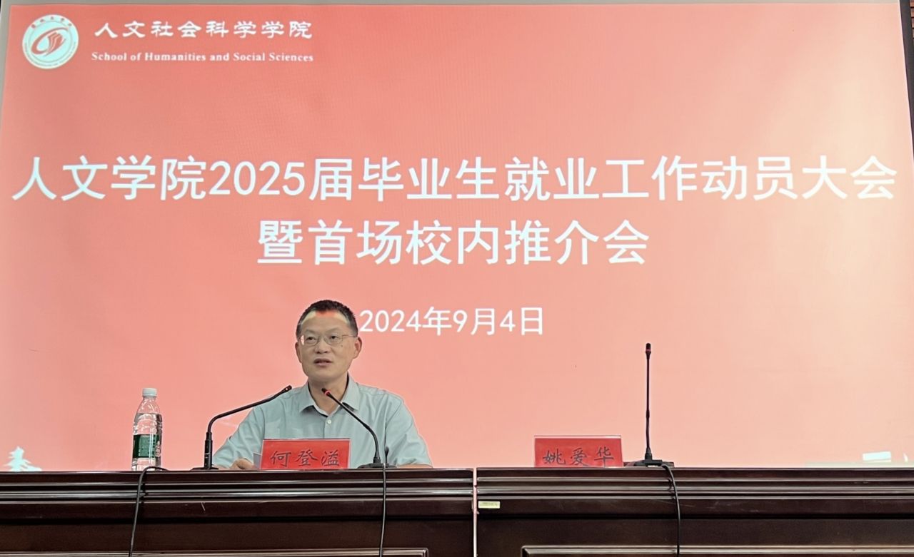 为提升2025届毕业生的就业竞争力,激发毕业生就业积极性和主动性,推动毕业生实现高质量充分就业,9月4日下午,人文学院在南校区润美楼报告厅举办2025届毕业生就业工作动员大会暨首场校内推介会。学院党总支书记何登溢、党总支副书记姚爱华、学工办副主任魏语婷,毕业班辅导员许建文及全体2025届毕业生参加大会。