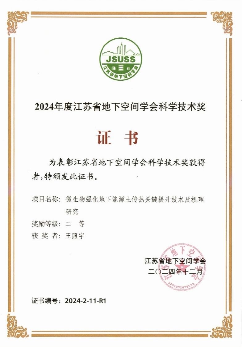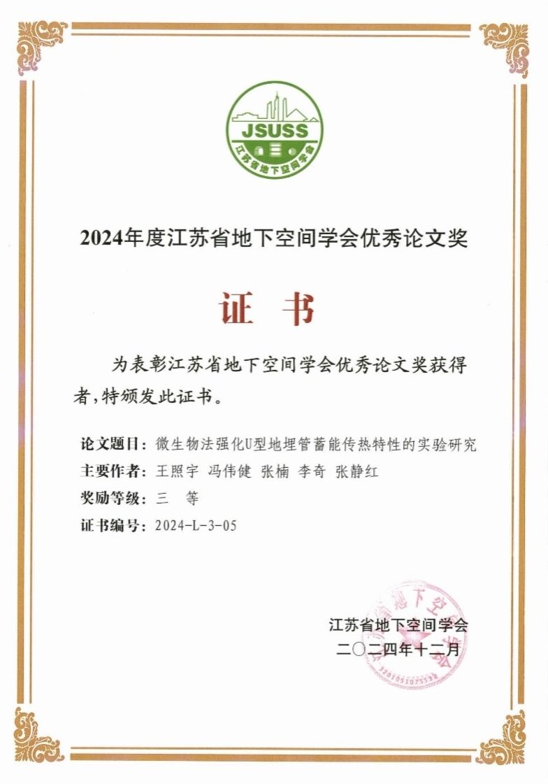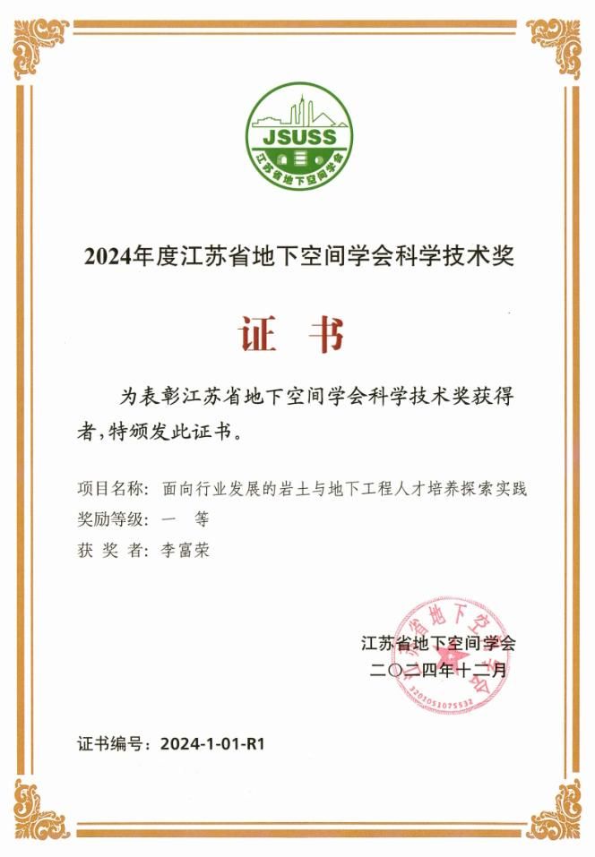 大会颁发了2024年度江苏省地下空间学会科学技术奖,由李富荣牵头申报的“面向行业发展的岩土与地下工程人才培养探索实践”获软科学研究类一等奖,王照宇团队牵头申报的“微生物强化地下能源土传热关键提升技术及机理研究”获技术发明和技术开发类二等奖,王照宇团队完成的“微生物法强化U型地埋管蓄能传热特性的实验研究”获优秀论文三等奖。会议期间,李富荣介绍了真人赌博游戏_澳门赌博网-app*官网城市地下空间工程专业建设、人才培养、参与学会活动情况,并与参会的相关高校及企业的领导、专家进行了充分交流。