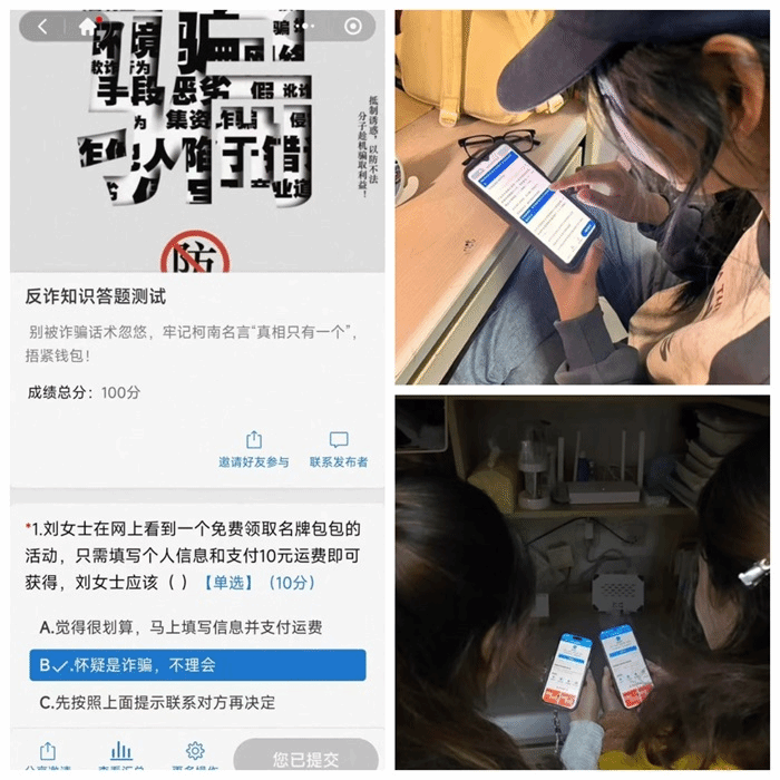 3月初,学院在各年级先后开展线上反诈知识答题测试,题目涵盖网络诈骗、电话诈骗、短信诈骗等多种常见的诈骗手段,内容涉及识别诈骗行为的方法,遇到诈骗时的应对策略和处置流程等,使学生进一步了解当前常见的诈骗手段,提高识别诈骗手段的能力,帮助学生在实际生活中更好地应对各种诈骗手段,确保反诈知识入脑入心。