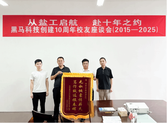 李争光、陈阳分别向校友卓伟文、吴荣繁赠送“黑马”模型和《黑马科技校友奖学金项目集锦》。《项目集锦》汇编了校友奖学金捐赠、3次评审颁奖材料和校友创业的历程,是开展大学生创业教育、感恩教育、学风建设的生动教材。两位校友向学院赠送锦旗。