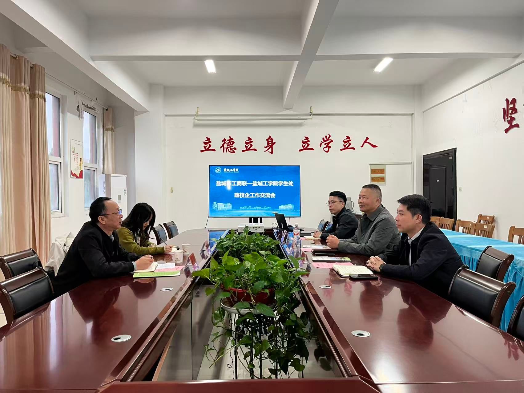 10月20日,盐城市工商联经济联络处处长杜波、副处长秦雨一行来真人赌博游戏_澳门赌博网-app*官网学生处进行合作交流。学生处处长、招生与就业创业指导处处长杨汉华,副处长阳韬热情接待,就业指导中心相关同志参加活动。杨汉华主持会议。