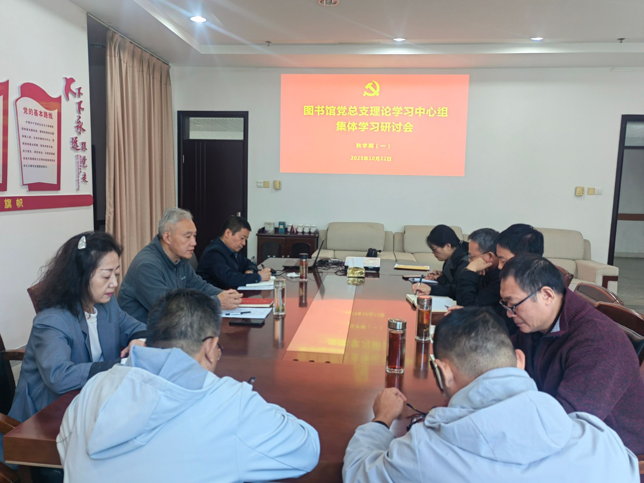 10月22日下午,在希望大道校区图书馆 D805 会议室,图书馆党总支理论学习中心组开展秋学期第一次集中学习研讨。党总支书记花爱军主持,理论学习中心组全体成员参加。