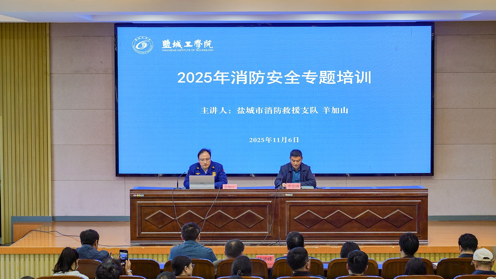 为深入贯彻全省、全市消防宣传月活动的工作要求,切实提升全校师生消防安全意识,提高应急避险与自救互救能力,筑牢校园安全“第一道防线”,11月6日上午,真人赌博游戏_澳门赌博网-app*官网邀请市消防救援支队法制科科长羊加山作专题消防安全培训。培训活动由安保处处长李义峰主持,后勤服务集团总经理潘文东、副总经理岳红印,学生处副处长马晓英,安保处副处长林沛峰等出席活动,后勤服务集团员工、实验室专任教师、学工办主任、安保人员及学生代表320余人参加活动。