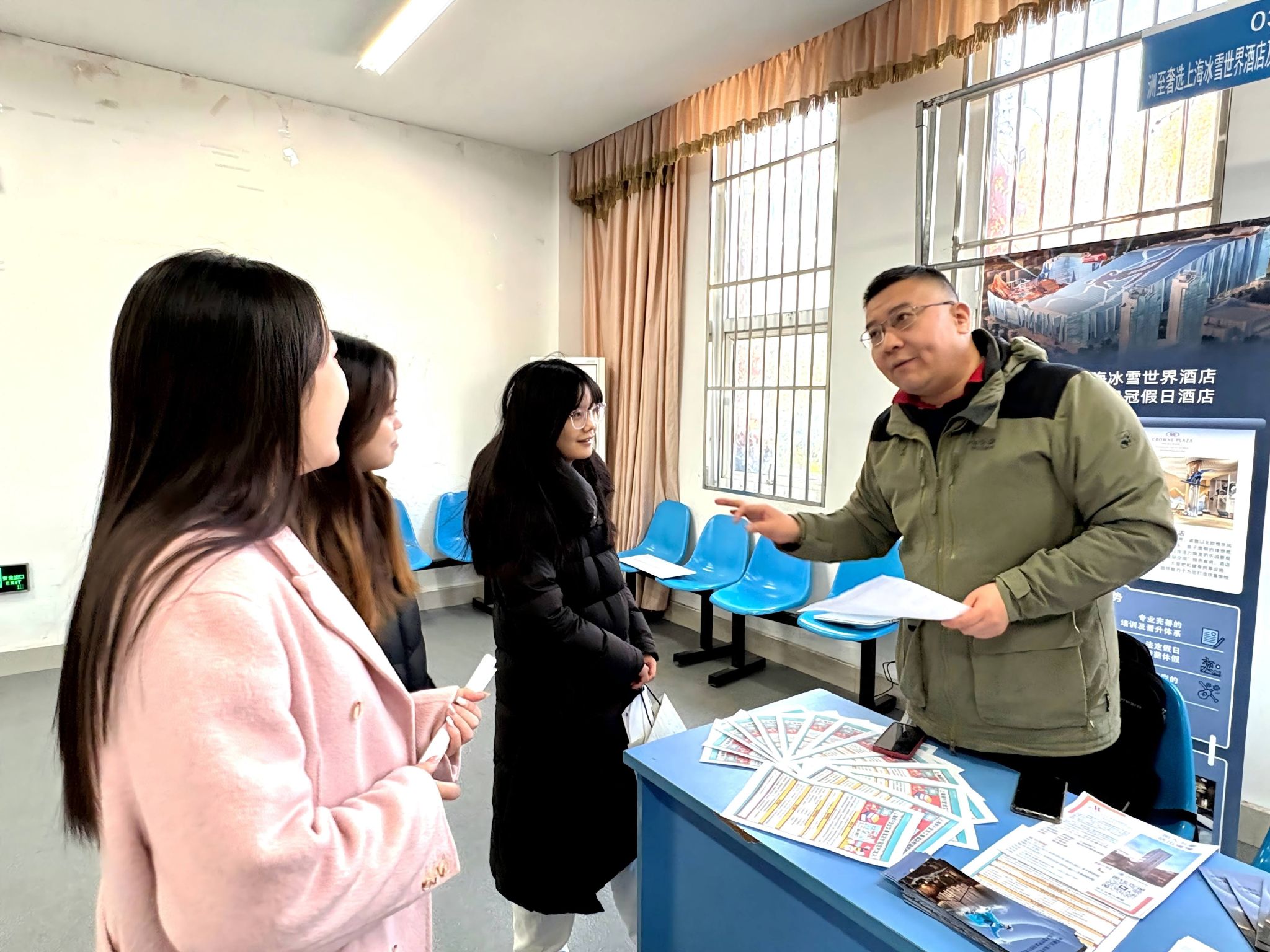 本次招聘会共有35家文旅行业的企业参会,其中包括万豪、希尔顿、锦江、洲际、华住等享誉国内外的酒店集团以及盐城市盐南高新区新东方文化艺术有限公司、江苏粉笔培训中心有限公司、盐城先行教育科技有限公司、江苏海马纺织机械有限公司、江苏淘米信息科技有限公司等诸多优质企业,提供300余个就业岗位。活动现场各参展企业通过宣传海报、宣传册、企业视频等多种形式展示企业文化、岗位需求。招聘会现场气氛热烈,秩序井然。毕业生们手持精心准备的简历,积极与用人单位交流,主动了解岗位要求、发展路径及企业文化,并结合自身专业与职业规划寻找心仪机会。企业代表也通过面对面沟通,向同学们详细介绍公司概况、岗位职责与人才培养机制,实现高效双向选择。