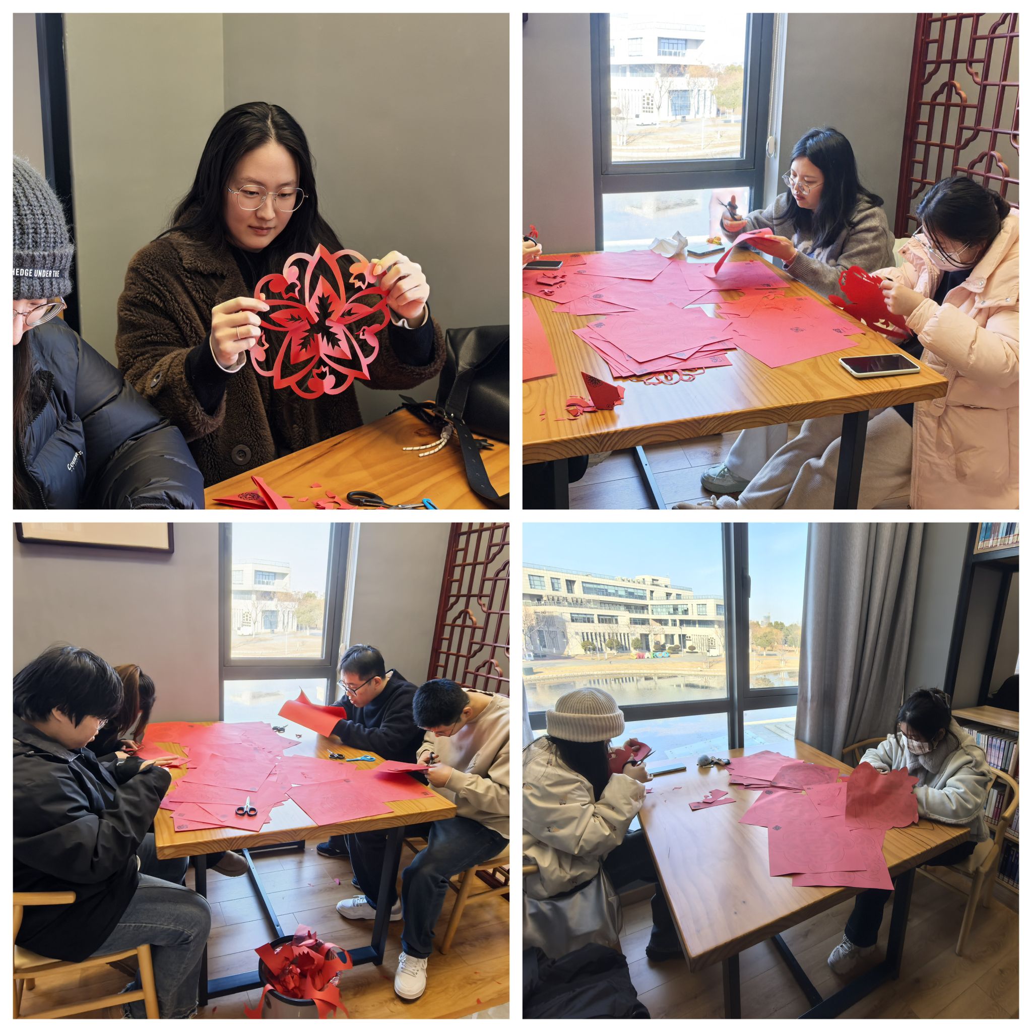活动现场墨香氤氲,暖意融融,设有写对联、剪窗花、拓印红包三个环节。同学们围绕新年祝福等主题挥毫创作,将对新岁的期盼与家国深情凝于笔端;红纸在巧手中翻飞,裁出各式吉祥图案;更将春联与剪纸艺术结合,拓印成独具创意的专属红包。全场洋溢着浓厚的节日气氛与欢声笑语。活动尾声,师生将亲手完成的作品赠予导师、宿管人员与同窗,让真挚祝福伴随笔墨艺趣传递校园,于文化传承中凝聚深厚情谊。