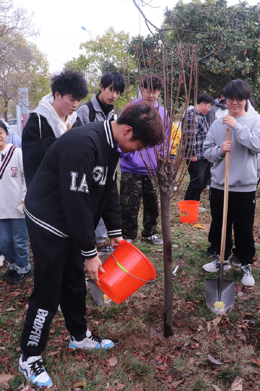 植树活动现场,校后勤服务集团为同学们提供了铁铲、水桶等植树工具,同学们在工作人员的指导下展开劳动。大家既有分工又有协作,严格按照流程认真细致地挥锹挖土、扶苗填坑、夯土浇水,充分发扬不怕苦、不怕累的精神,干劲十足,热情高涨。B服装222班的王佳雯表示,“一年之计在于春,亲手种一棵树,就是把自己的一片情意种在了这里”;B环艺221班的陈博林感叹道,“在大一我们一起种下树苗,等大四甚至毕业后,我们还可以在植树节相聚于此,我觉得这是个很有意义的活动”。随后,大家在栽种好的树苗前合影留念,并在润美楼前拍摄年级合照;部分大二学子也在活动当天前来看望去年种下的小树苗,并为其除草、浇水、施肥;还有一些班级开展特色团日活动,在树苗周围栽种多肉植物。
