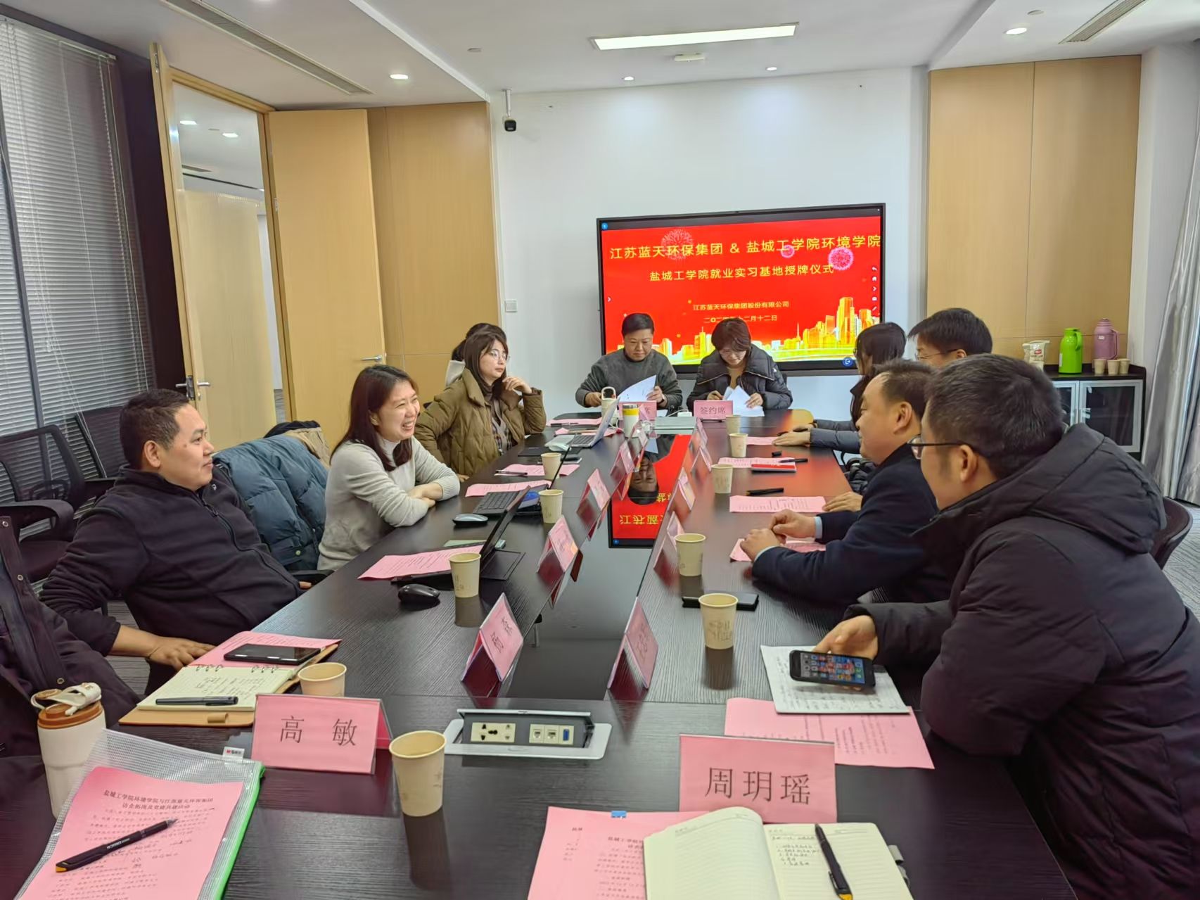 12月12日,为进一步发挥党建引领作用,深入贯彻落实真人赌博游戏_澳门赌博网-app*官网“访企拓岗促就业”专项行动工作要求,推进校企深度融合发展,拓展学生就业渠道,环境学院院长陈天明带队到江苏蓝天环保集团开展“访企拓岗促就业”专项行动暨党建共建活动。环境学院副院长杨百忍、党总支副书记王丽坤,江苏蓝天环保集团常务副总经理谭琨、环保技术部部长庄泉、人事行政总监刘歆成出席。学院博士和学生代表、企业相关部门负责人参加。