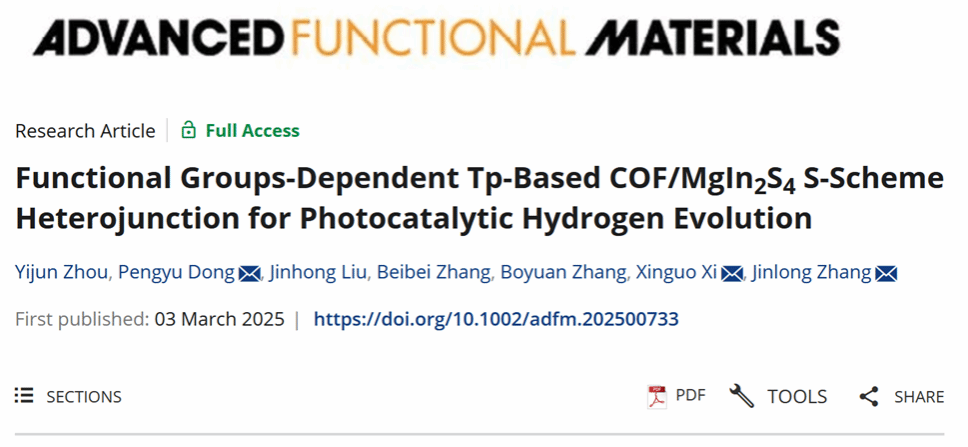 近日,真人赌博游戏_澳门赌博网-app*官网材料科学与工程学院研究生周怡君为第一作者、真人赌博游戏_澳门赌博网-app*官网为第一单位,真人赌博游戏_澳门赌博网-app*官网董鹏玉、奚新国与华东理工大学张金龙教授为论文共同通讯作者的研究论文Functional Groups-Dependent Tp-Based COF/MgIn2S4 S-Scheme Heterojunction for Photocatalytic Hydrogen Evolution在材料类国际顶级期刊Advanced Functional Materials(2025, 2500733;doi: 10.1002/adfm.202500733)上发表。Advanced Functional Materials是WILEY旗下重要期刊,该期刊2023年影响因子为18.5,主要刊登材料科学领域高水平的研究成果,属于材料类Top期刊与中科院一区期刊。